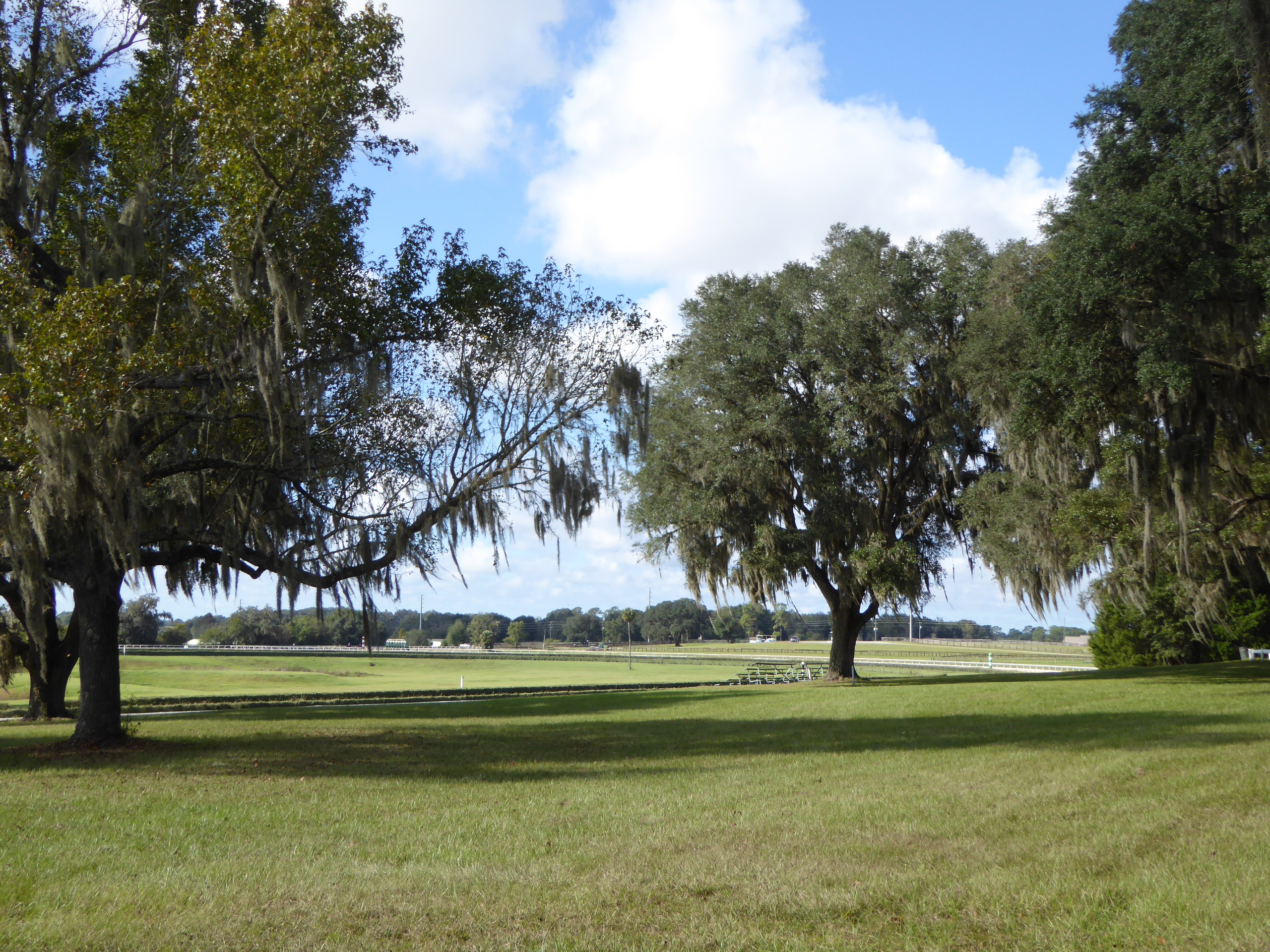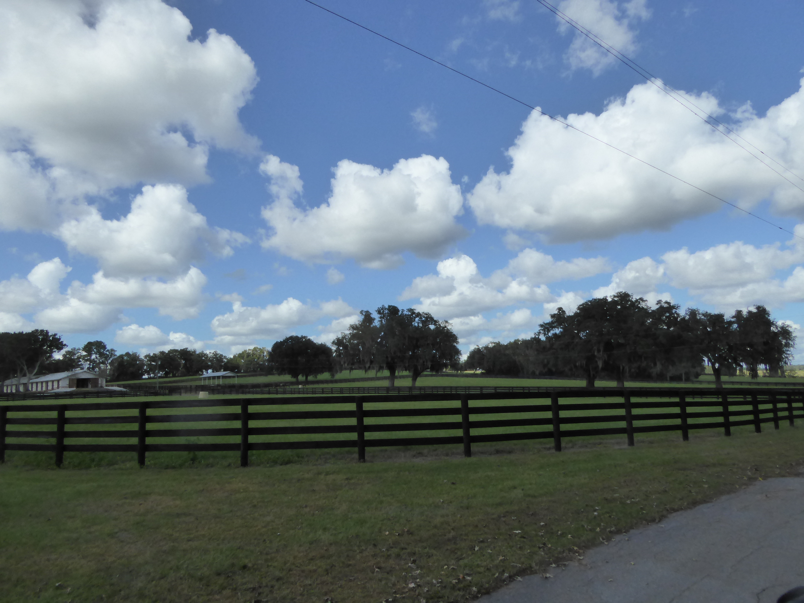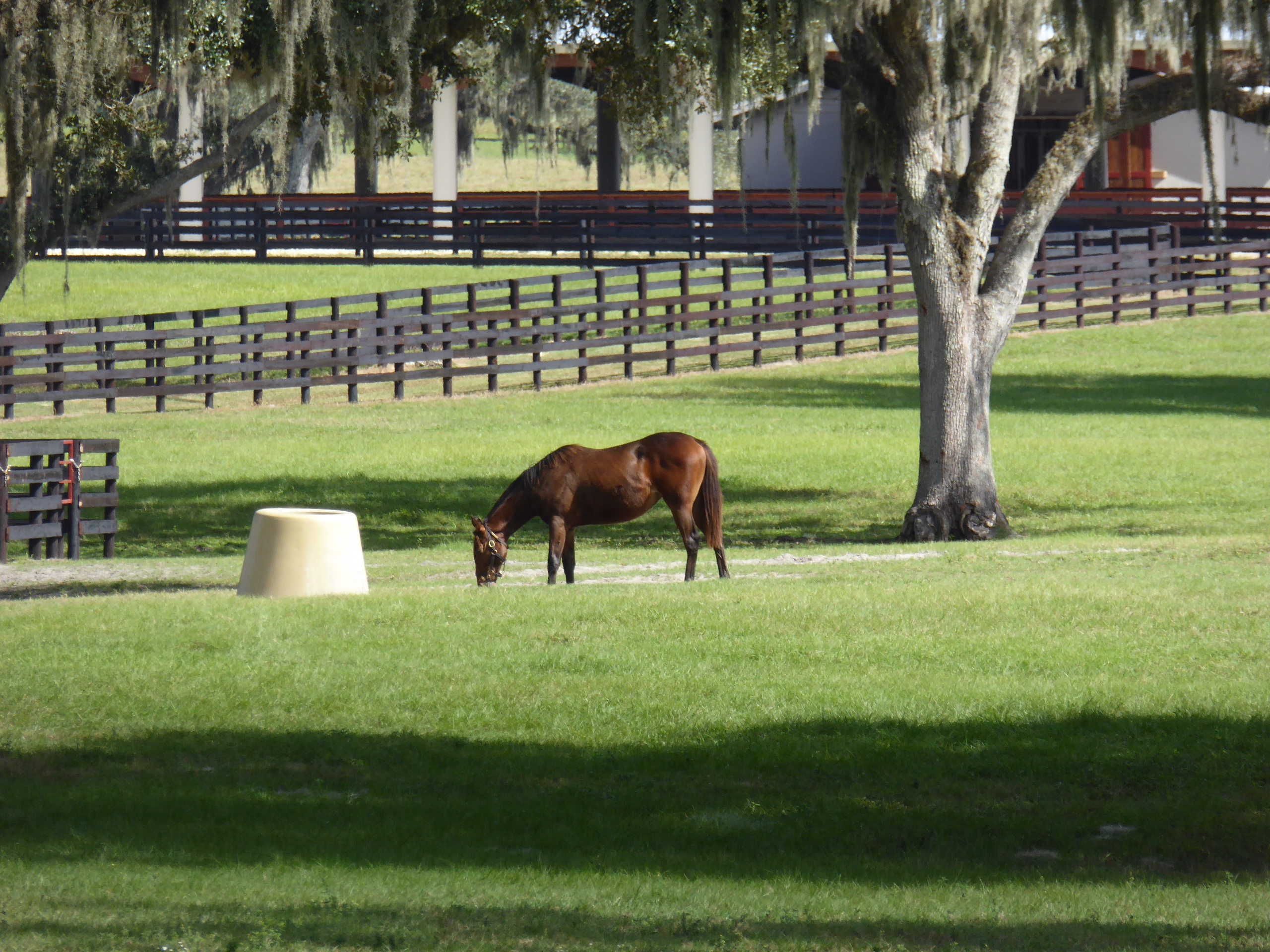Early November, 2015. We came to Florida earlier than we expected. Specifically, we were in Connecticut in mid-October and learned that we needed yet another repair…this time we feared the large, driver side slide-out floor needed to be replaced. Since winter was setting in and all the RV facilities were winterizing coaches, we couldn’t find anyone to help us and even if we could have, time didn’t permit us to stay any longer in New England because of the weather. Florence located a top notch RV dealership (the old Monaco plant) near The Villages/Wildwood in Central Florida, so off we went. The good news is that we didn’t need a 5 week-long $15,000 repair. The bad news is that even so, we spent a pretty penny and were detained a total of two weeks. So, our arrival in Gulf Shores was an entire week late. Oh, well. Anyhow, my pictures of Florida are not nearly as complete as they’ll be when we finally explore the state (perhaps next year) and see what it has to offer. But we did manage to find one very interesting thing to do while our repairs were being done. We drove a half hour to Ocala, in Marion County and toured some of the absolutely incredible thoroughbred horse farms there. Marion County is the fourth largest thoroughbred breeding, breaking and training facility in the world. See my post dated early November, 2015 for some information about this fascinating area.